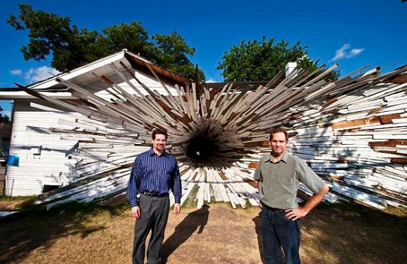 “At first glance, these houses looks like they could have been the victim of a dramatic gas explosion. But the beat-up homes in Houston, Texas, are in fact an elaborate traffic-stopping work of art using the homes’ own wood siding. Artists Dan Havel and Dean Ruck smashed the interior walls of the homes, before nailing the wooden planking at strange angles to complete their project. Featuring several horizontal and vertical vortices which appear to ‘rip’ through the interior of the first house, the designs offer a unique view out of each of the buildings. The front of the house is designed to act as a stage, but is only meant to be a temporary exhibit.”