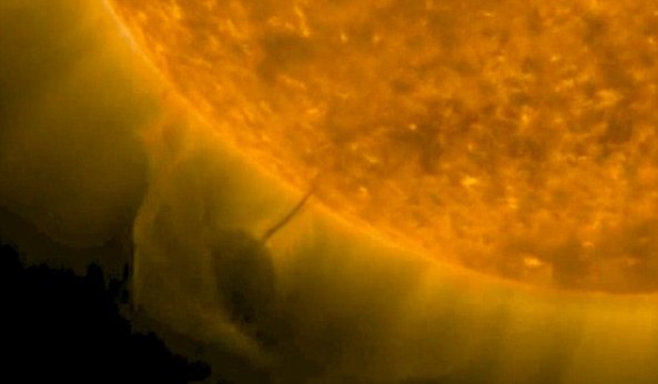 An orbiting Nasa space telescope captured a dark, planet-sized object flying close to the sun on Monday – and extending what looks like a refueling tube into the star’s surface.