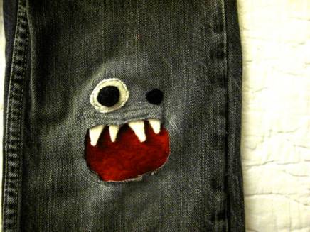 Refashion Co-Op’s Resweater shows us a great technique for machine-stitched monster-patches for your holey jeans.